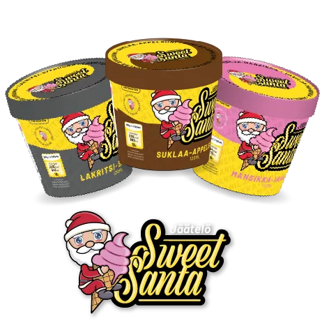Osta 10 myyntierää Sweet Santa ja/tai Bad Santa tuoteperheen tuotteita. Hyvitämme yhden myyntierän teille täysimääräisesti. Tuotteemme löytyvät 120 ml pikareina ja 5 litran delipackeina. Pikareissa yksi myyntierä on 16 pikaria ja delipackeissa yksi delipack on myyntierä.